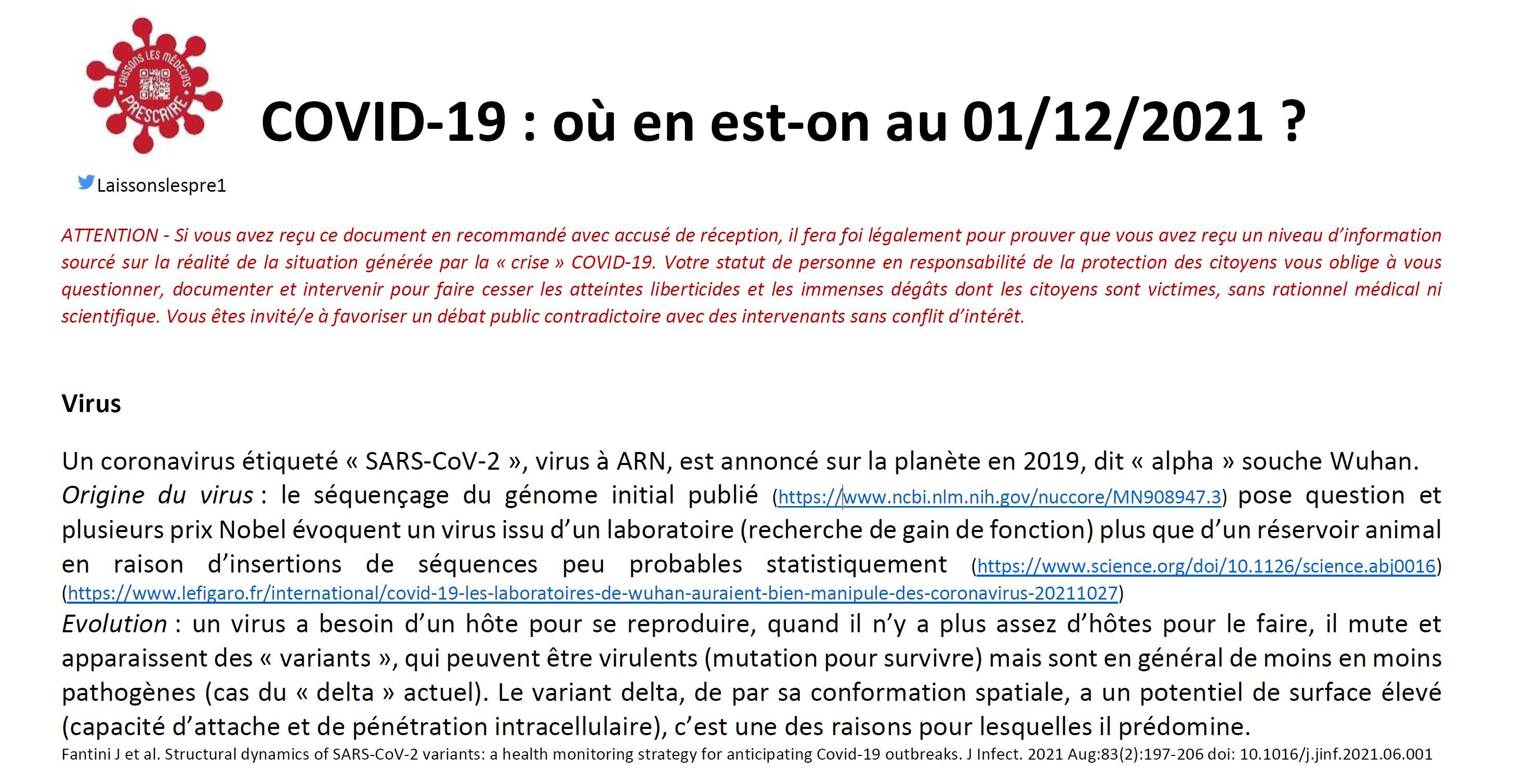 Cette note de synthèse scientifique réalisée par les médecins de Laissons Les Médecins Prescrire est introduite par un paragraphe destiné à inciter le destinataire à agir dans son champ de responsabilité : "Si vous avez reçu ce document en recommandé avec accusé de réception, il fera foi légalement pour prouver que vous avez reçu un niveau d’information sourcé sur la réalité de la situation générée par la « crise » COVID-19. Votre statut de personne en responsabilité de la protection des citoyens vous oblige à vous questionner, documenter et intervenir pour faire cesser les atteintes liberticides et les immenses dégâts dont les citoyens sont victimes, sans rationnel médical ni scientifique. Vous êtes invité/e à favoriser un débat public contradictoire avec des intervenants sans conflit d’intérêt."