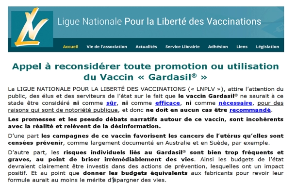 La LIGUE NATIONALE POUR LA LIBERTÉ DES VACCINATIONS (« LNPLV »), attire l’attention du public, des élus et des serviteurs de l’état sur le fait que le vaccin Gardasil® ne saurait à ce stade être considéré ni comme sûr, ni comme efficace, ni comme nécessaire, pour des raisons qui sont de notoriété publique, et donc ne doit en aucun cas être recommandé.