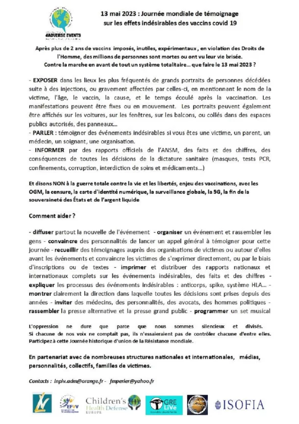 13 mai 2020 à partir de 10h00 : Un appel mondial de témoignages de personnes ayant eu des effets indésirables suite à la vaccination covid