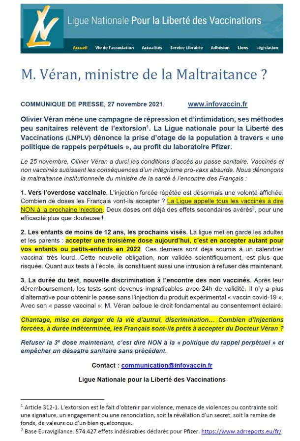 COMMUNIQUE DE PRESSE, 27 novembre 2021. Olivier Véran mène une campagne de répression et d’intimidation, ses méthodes peu sanitaires relèvent de l’extorsion[1]. La Ligue nationale pour la Liberté des Vaccinations (LNPLV) dénonce la prise d’otage de la population à travers « une politique de rappels perpétuels », au profit du laboratoire Pfizer.