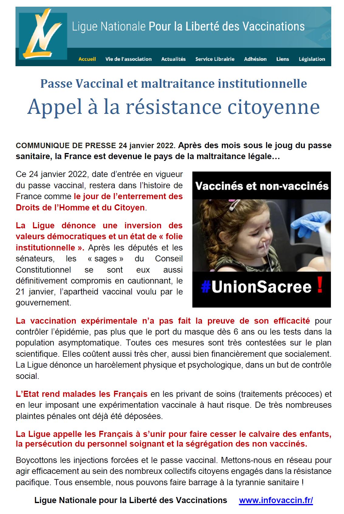 La ligue appelle les Français à s’unir pour faire cesser le calvaire des enfants, la persécution du personnel soignant et la ségrégation des non vaccinés.