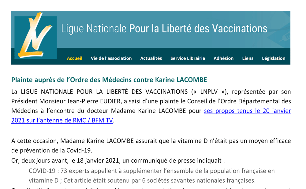 La LIGUE NATIONALE POUR LA LIBERTÉ DES VACCINATIONS (« LNPLV »), représentée par son Président Monsieur Jean-Pierre EUDIER, a saisi d’une plainte le Conseil de l’Ordre Départemental des Médecins à l’encontre du docteur Madame Karine LACOMBE pour ses propos tenus le 20 janvier 2021 sur l’antenne de RMC / BFM TV.