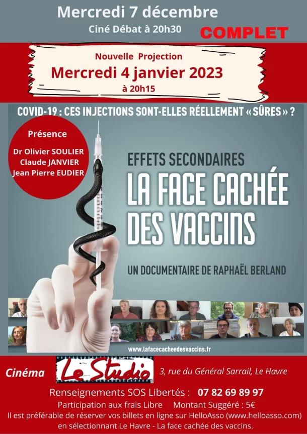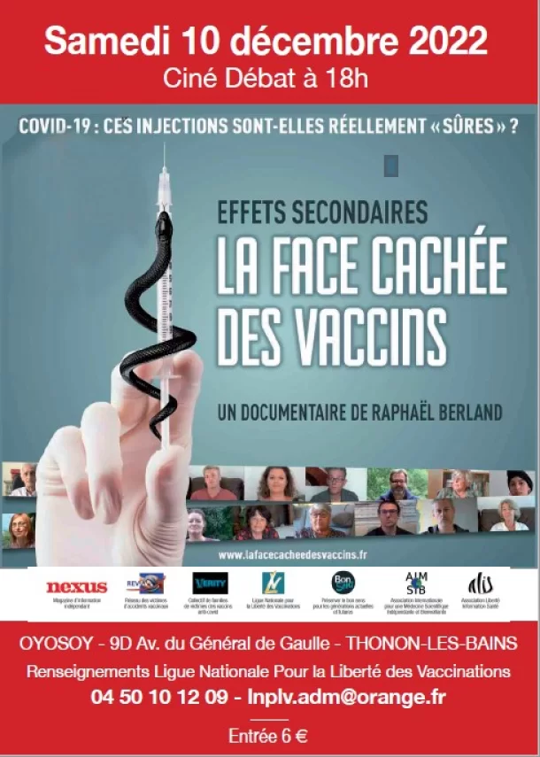 Le documentaire de Raphaël Berland " Effets secondaires, la face cachée des vaccins " sera diffusé le samedi 10 décembre 2022 à 18h00, et sera suivi d'un débat.